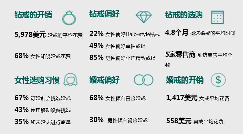 美国新人平均花费4.8个月的时间来挑选订婚钻戒,至少要到访5家珠宝店进行挑选, 钻戒平均开销为5,978美元。 就婚戒而言,68%女性倾向白金戒指; 30%的男性则倾向钨金戒指。女款婚戒的平均花费为1,417美金; 男款则为558美金,几乎为女款婚戒费用的三分之一。