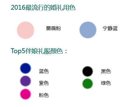 当下美国最流行的婚礼主打色是蔷薇粉与宁静蓝, 而排名前五的伴娘礼服颜色为蓝色、紫色、粉色、黑色及绿色。当然,一场完美的婚礼,也少不了鲜花的装点,玫瑰、马蹄莲、绣球花、满天星以及芍药都是眼下的大热之选。